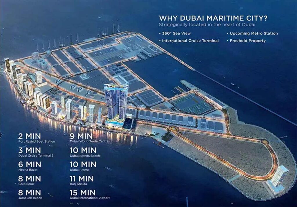 Figure 2: Dubai Maritime City master plan showing strategic location with 360° sea views, proximity to international cruise terminal, and connectivity to key Dubai landmarks