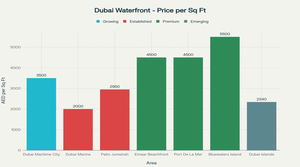 • Dubai Harbour/Emaar Beachfront: AED 4,500-6,000 per sq ft (29-57% premium)