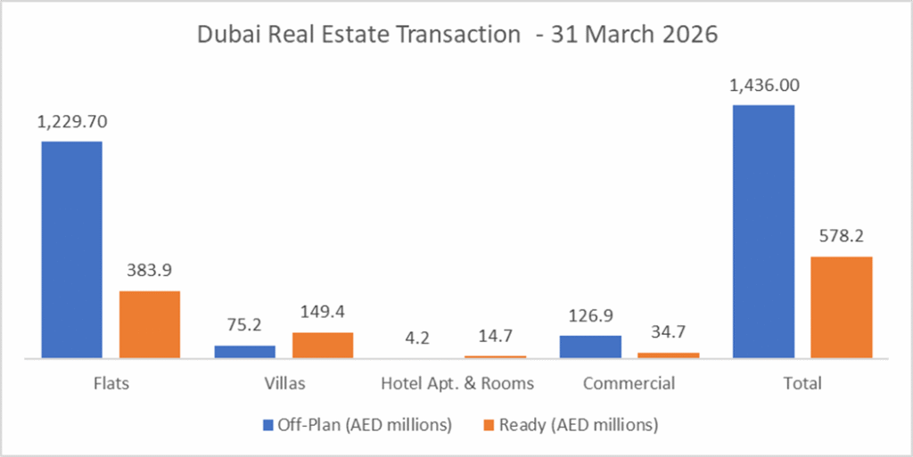 On the 31-Mar-2026, the total transacted value reached AED 2,014,208,203. Off-plan dominated with AED 1,436,009,363 (71.3%), while Ready accounted for AED 578,198,840 (28.7%).