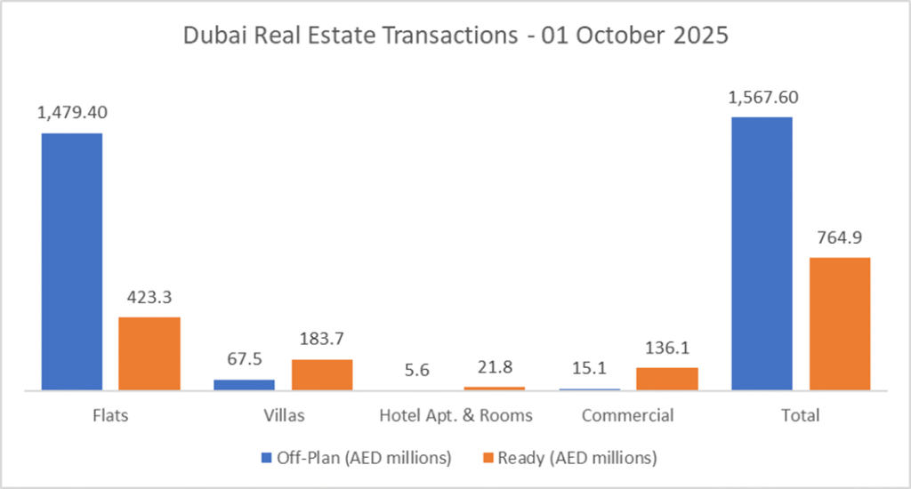On the 01-Oct-2025, the total transacted value reached AED 2,332,495,222. Off-plan dominated with AED 1,567,640,332 (67.2%), while Ready accounted for AED 764,854,890 (32.8%).