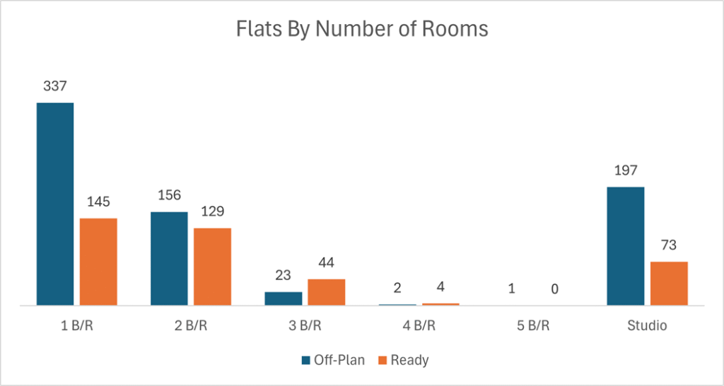 Off-plan activity was heavily concentrated in flats, with limited contribution from villas and minimal from hospitality and commercial units.