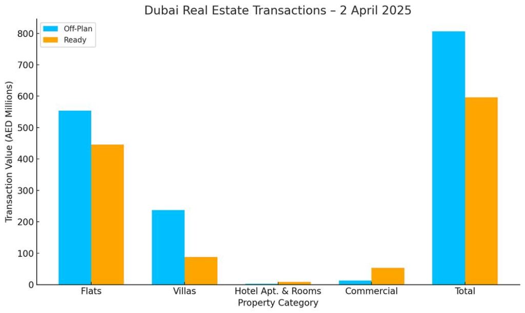 Dubai’s real estate market continued its robust performance on 2 April 2025, recording a total transaction value of AED 1,401,884,211. The market activity was led by a dominant off-plan segment, complemented by steady activity in the ready property market.