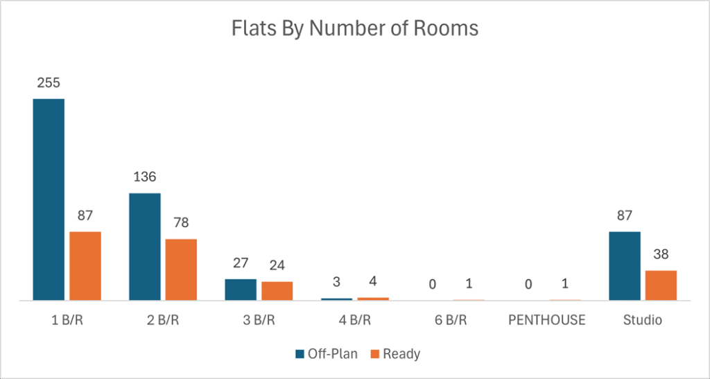 Off-plan activity was overwhelmingly led by flats (~90% of value), with villas a distant second and limited commercial/hotel volumes.