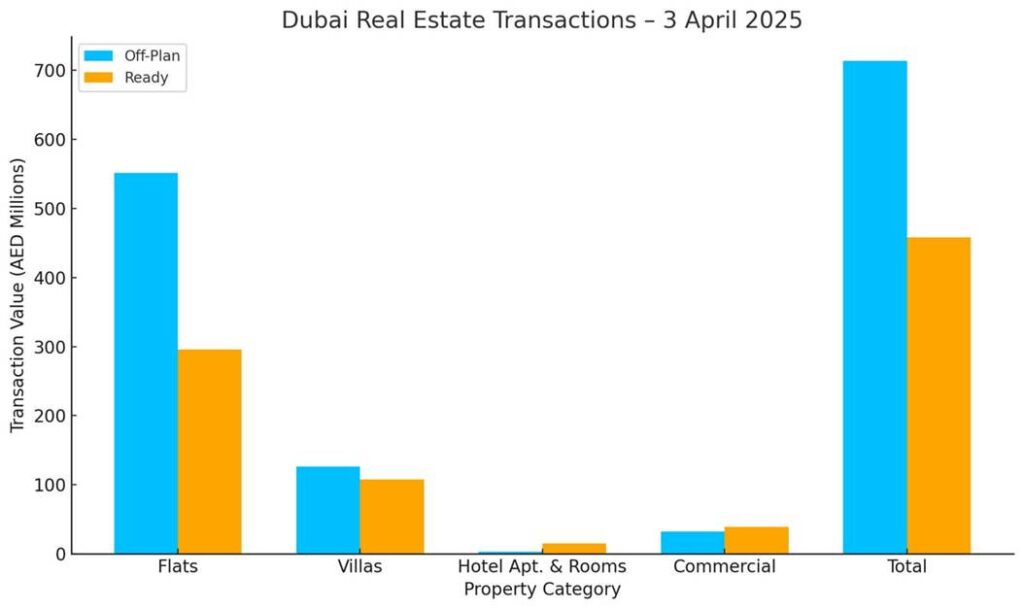 Dubai’s real estate market sustained its momentum on 3 April 2025, recording a total transaction value of AED 1,170,896,016. Off-plan sales led the day’s activity, with ready property transactions also showing strong performance across residential and commercial segments.