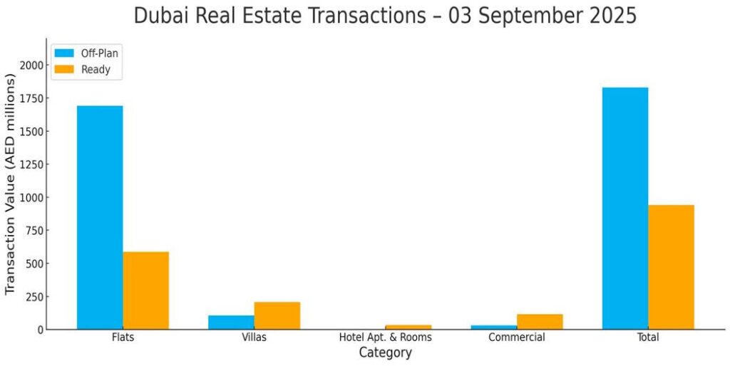 On the 3rd of September 2025, the total transacted value reached AED 2,769,972,851. Off-plan dominated with AED 1,829,290,309 (66.04%), while Ready accounted for AED 940,682,541 (33.96%).