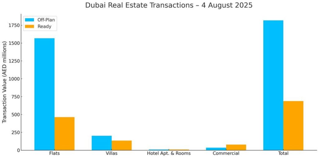 On 4 August 2025, Dubai’s property market recorded total transactions worth AED 2.51 billion. Off-plan deals contributed AED 1.82 billion (72.5 %), while ready properties added AED 0.69 billion (27.5 %).