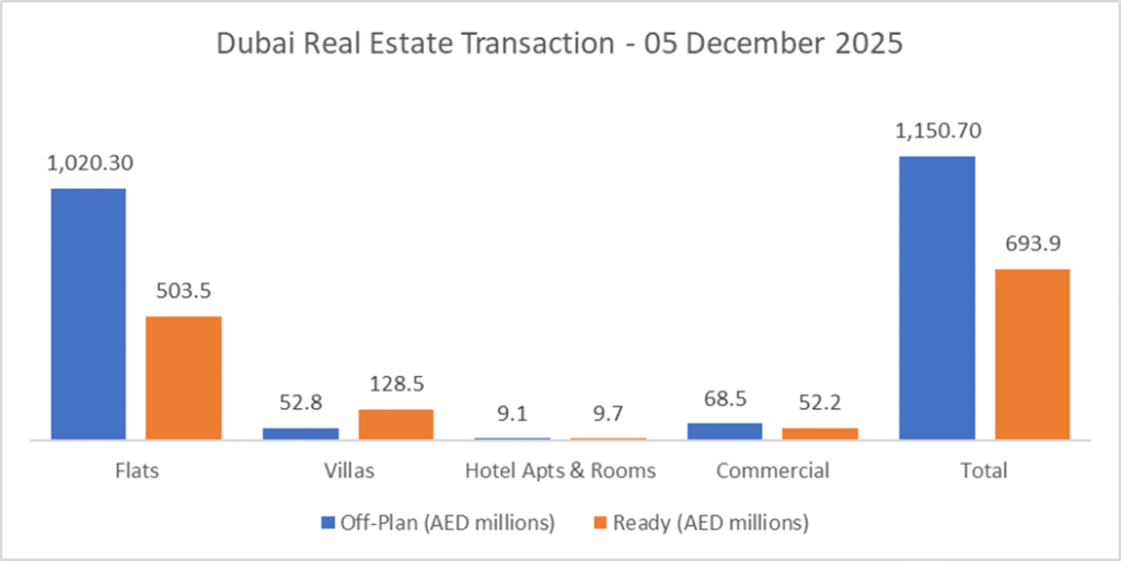 On 4 December 2025, the total transacted value in Dubai’s property market reached AED 1.84 billion. Off plan once again led the market with AED 1.15 billion (62.4%), while ready properties contributed AED 693.9 million (37.6%).