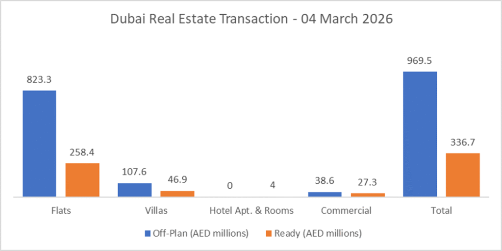 On the 04-Mar-2026, the total transacted value reached AED 1.31B. Off-plan dominated with AED 0.97B (74.2%), while Ready accounted for AED 0.34B (25.8%).
