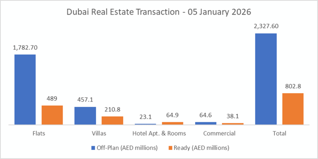 On the 05-Jan-2026 (1-5 Jan), the total transacted value reached AED 3.13bn. Off-plan dominated with AED 2.33bn (74.4%), while Ready accounted for AED 802.8m (25.6%).