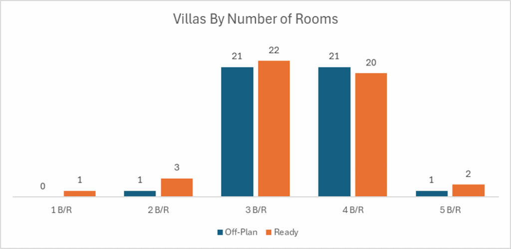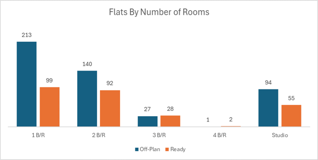 Off-plan activity was led decisively by flats, with villas providing a meaningful secondary lift and limited commercial/serviced-apartment contributions.