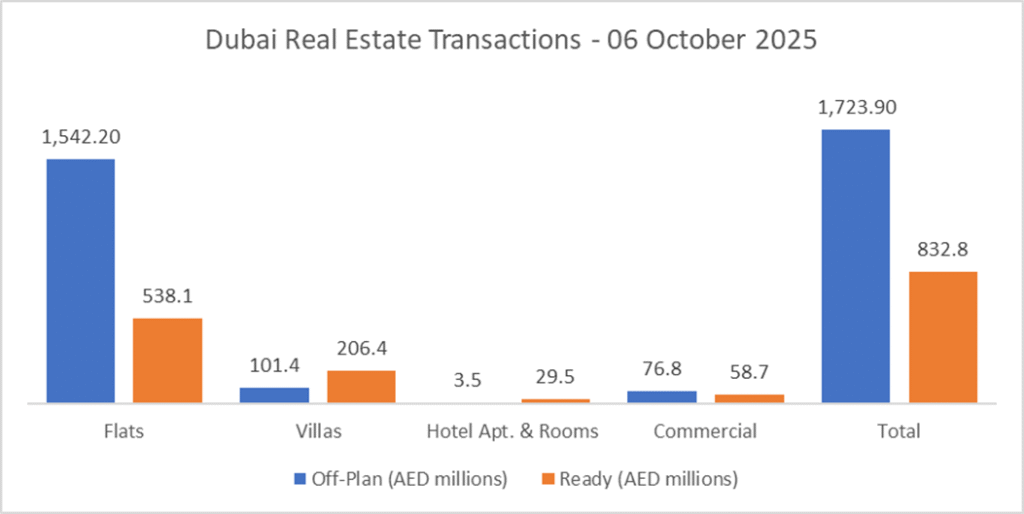 On 06-Oct-2025, the total transacted value reached AED 2.56 billion. Off-plan dominated with AED 1.72 billion (67.4%), while Ready accounted for AED 0.83 billion (32.6%).