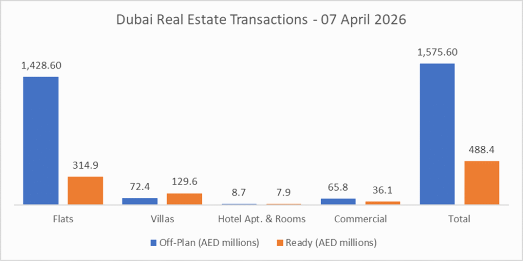 On the 07-Apr-2026, the total transacted value reached AED 2.06 billion. Off-plan dominated with AED 1.58 billion (76.3%), while Ready accounted for AED 488.4 million (23.7%).