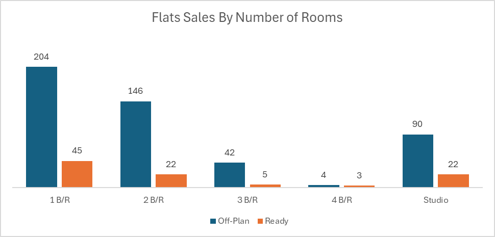 Off-plan activity overwhelmingly centered on flats, showing that buyer appetite remained concentrated in the apartment segment, while villas and commercial assets played a much smaller supporting role.