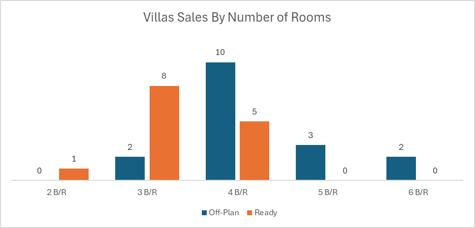 The ready market was more balanced than off-plan, with flats still leading but villas taking a meaningful share, suggesting continued demand from end-users and buyers seeking immediately available stock.