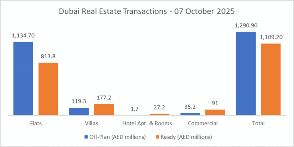 On 07-Oct-2025, the total transacted value reached AED 2,400,111,418. Off-plan dominated with AED 1,290,925,451 (53.8%), while Ready accounted for AED 1,109,185,968 (46.2%).