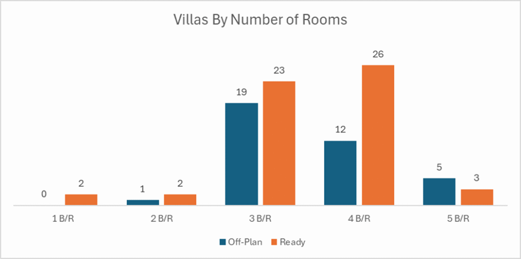 A balanced split kept momentum firm: off-plan flats continue to set the pace, while ready demand remains solid, especially for flats and income-oriented commercial assets. Watch for sustained developer launches on the off-plan side and selective end-user/investor interest in ready villas and prime commercial.
