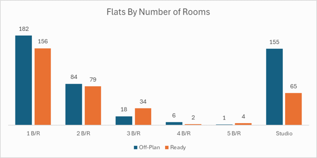 Off-plan activity was led overwhelmingly by flats, with villas a distant second and minimal hotel-apartment/commercial contribution.