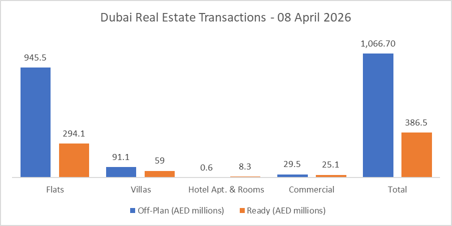 On the 08-Apr-2026, the total transacted value reached AED 1.45 billion. Off plan dominated with AED 1.07 billion (73.4%), while Ready accounted for AED 386.5 million (26.6%).