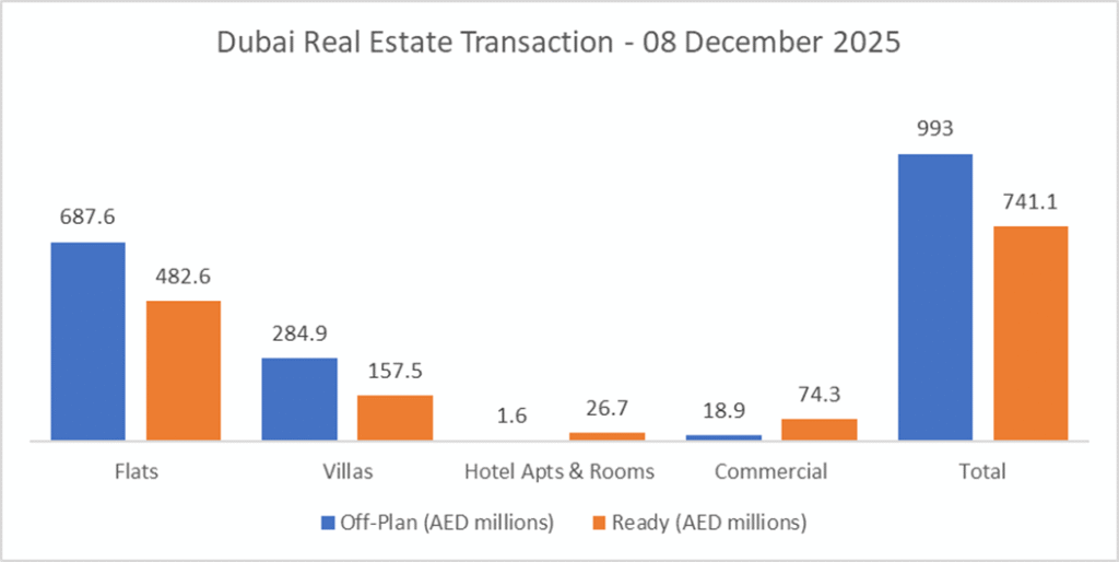 The 08-Dec-2025 figures show a balanced but off-plan–tilted market, with strong appetite for future-ready apartments and villas complemented by solid trading in completed homes. The relatively modest role of commercial and hospitality deals suggests investors remain focused on core residential exposure, while the near 60/40 split between off-plan and ready points to a market that is still in an expansionary yet broadly orderly phase.
