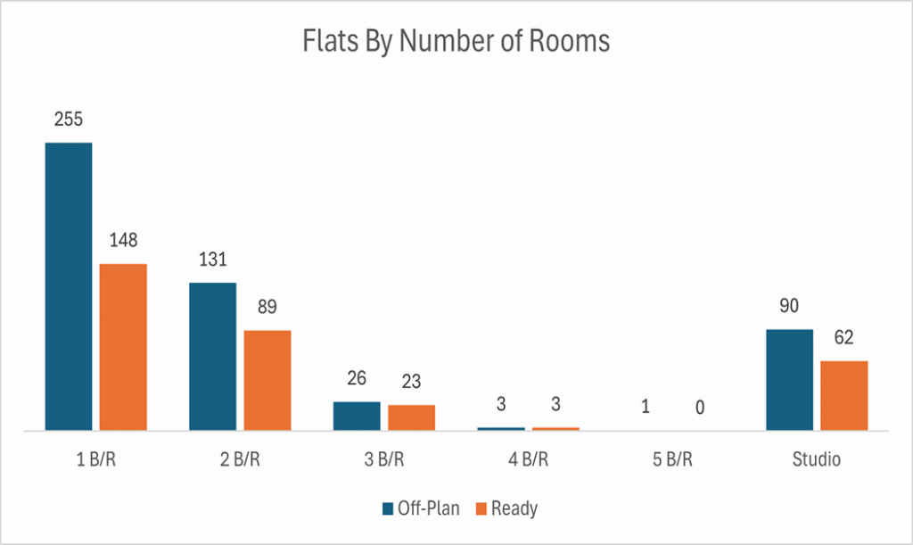 - Flats dominate both off-plan (89.2%) and ready (62.9%) segments, reflecting sustained demand for apartment living.
