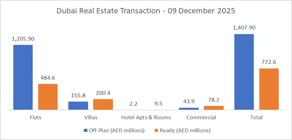 On the 09-Dec-2025, the total transacted value reached AED 2,180,495,339. Off-plan dominated with AED 1,407,850,683 (64.6%), while Ready accounted for AED 772,644,656 (35.4%).
