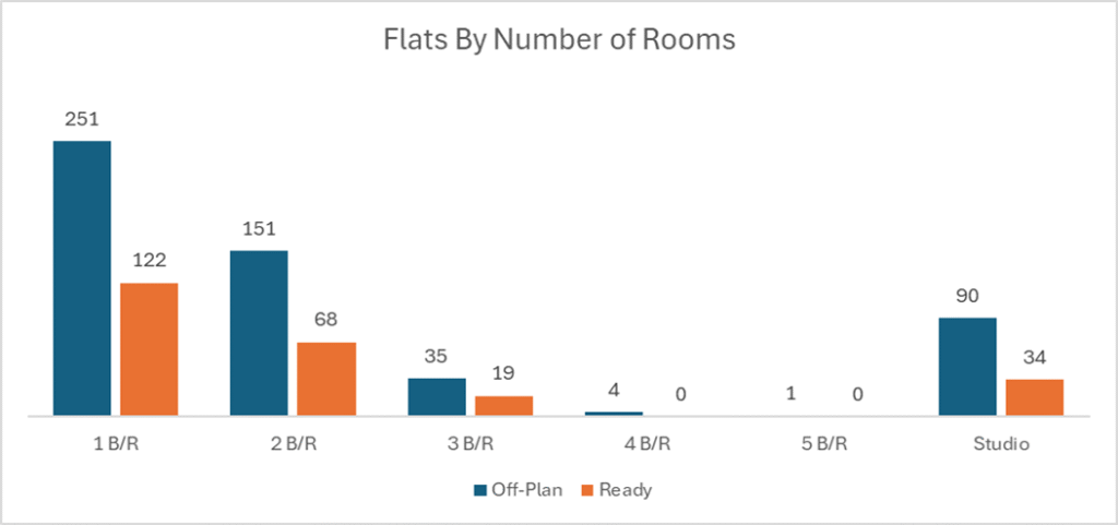 Off-plan activity is overwhelmingly apartment-led, with flats capturing the bulk of value and villas providing a meaningful secondary contribution, while hotel and commercial off-plan trades remain a small but supportive slice of the market.