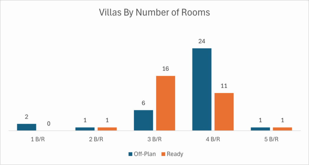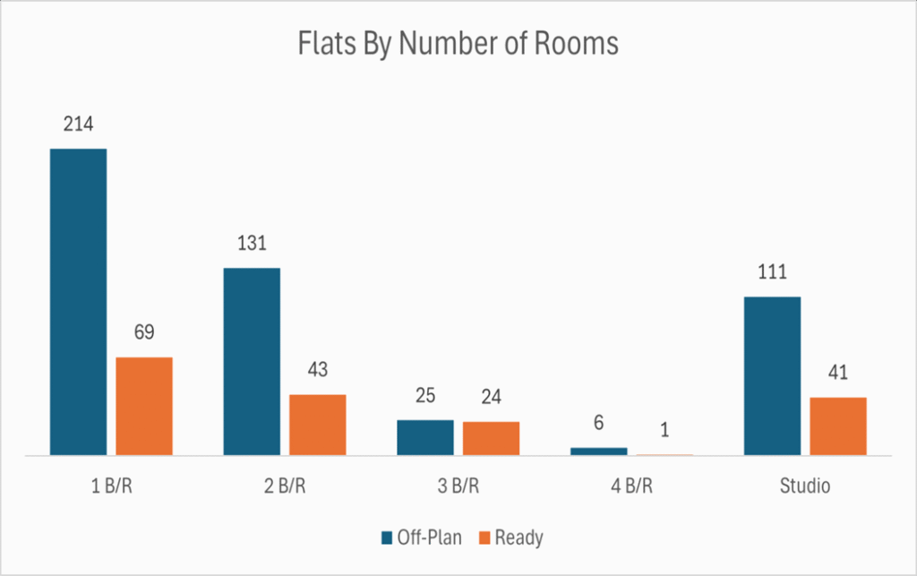 Off-plan flats overwhelmingly led activity, reflecting sustained demand for new apartment launches. Villas accounted for a modest single-digit share, while commercial and hospitality units remained niche segments.