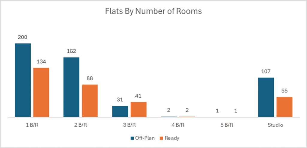 Overall activity was clearly risk-weighted toward off-plan, where flats captured the bulk of value. The ready market mirrored this structure with even stronger apartment concentration, suggesting end-user and investor liquidity continues to prioritize core residential stock, while non-residential activity remains present but secondary.