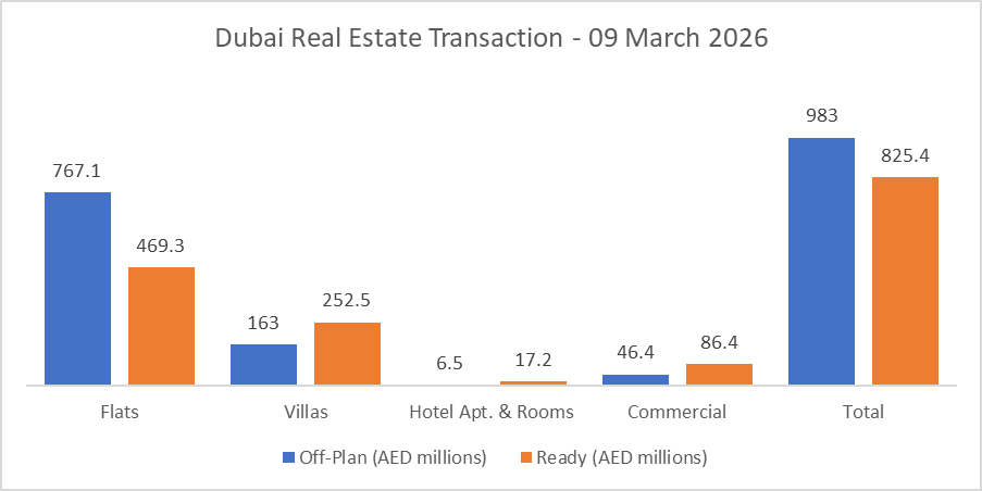 On the 10-Mar-2026, the total transacted value reached AED 1.81bn. Off-plan dominated with AED 983.0m (54.4%), while Ready accounted for AED 825.4m (45.6%).