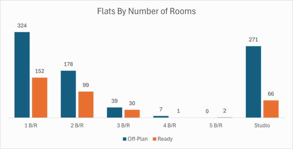 Off-plan offerings remain the market’s driving force, led by flat sales that continue to dominate investor interest. Villas hold a healthy 28.4% share of off-plan volume, reflecting strong demand for larger units. Ready properties, while smaller in overall volume, see flats and villas together representing over 85% of their segment, catering to buyers seeking immediate occupancy.