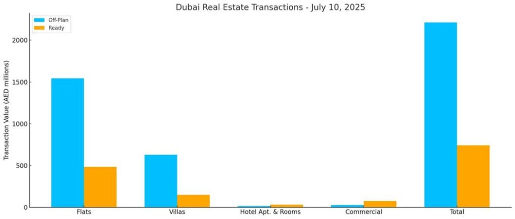 On 10 July 2025, Dubai’s total real estate transaction value reached AED 2.95 billion, with off-plan properties accounting for 74.9% and ready assets contributing 25.1% of the total volume.