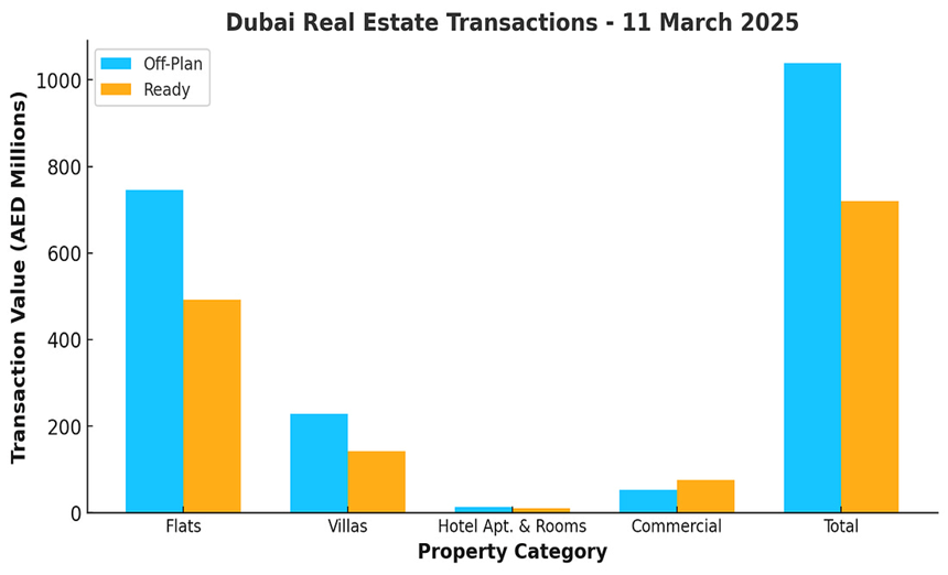 Dubai’s real estate market continues to demonstrate robust performance, with total property transactions reaching AED 1.76 billion on March 11, 2025. The off-plan segment accounted for 59.1% of the total transaction value, while ready properties made up 40.9%. This distribution highlights the continued demand for new developments and investment in off-plan properties, reflecting confidence in Dubai’s long-term growth.
