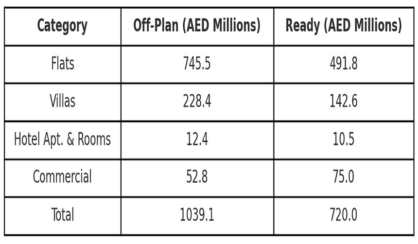The ready property market totaled AED 720 million, accounting for 40.9% of overall transactions. Key highlights include: