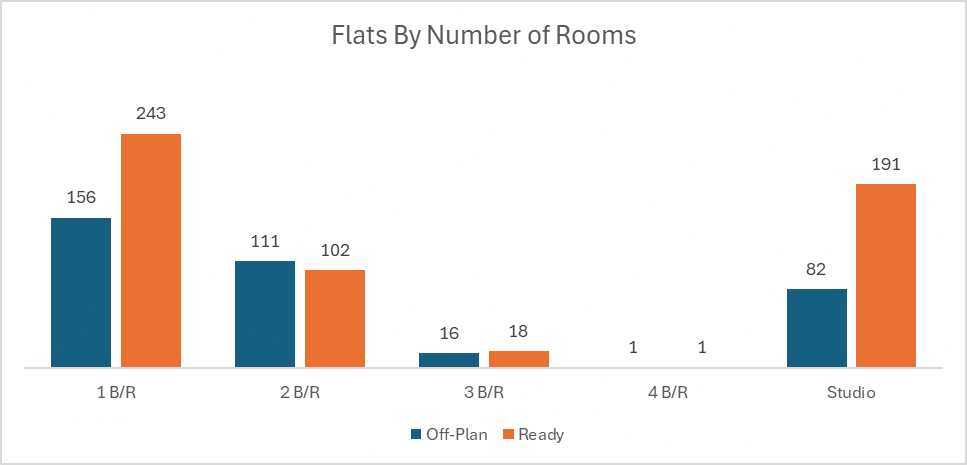 The ready market also leaned heavily toward flats, although villas captured a stronger share here than in off-plan, pointing to healthy demand for completed family-oriented stock alongside apartment transactions.