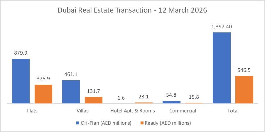 On the 12-Mar-2026, the total transacted value reached AED 1.94 billion. Off-plan dominated with AED 1.40 billion (71.9%), while Ready accounted for AED 546.5 million (28.1%).