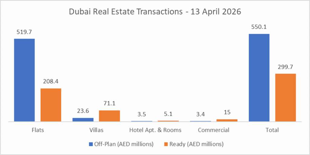 On the 13-Apr-2026, the total transacted value reached AED 849.8 million. Off-plan dominated with AED 550.1 million (64.7%), while Ready accounted for AED 299.7 million (35.3%). (The low transactions volume could be because of the DLD reporting)