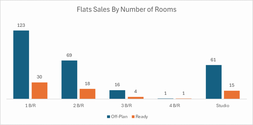 Off-plan activity was overwhelmingly driven by flats, with the segment showing a highly concentrated apartment-led profile and only limited contribution from villas, hospitality and commercial assets.