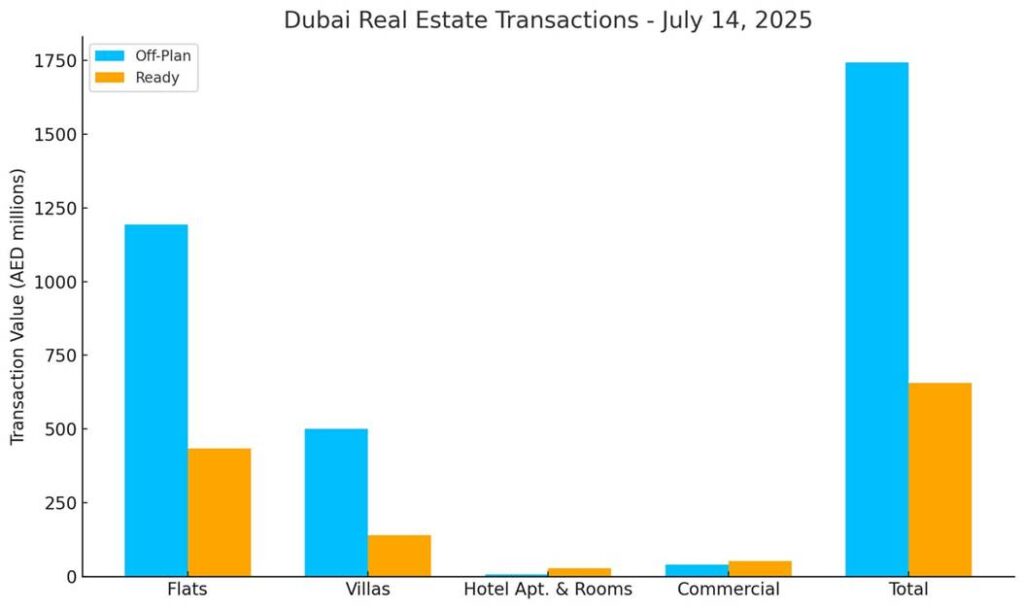 On the 14th of July, total transaction value reached AED 2.400 billion, with off-plan assets contributing 72.6 % (AED 1.743 billion) and ready properties 27.4 % (AED 0.657 billion) of the total volume.