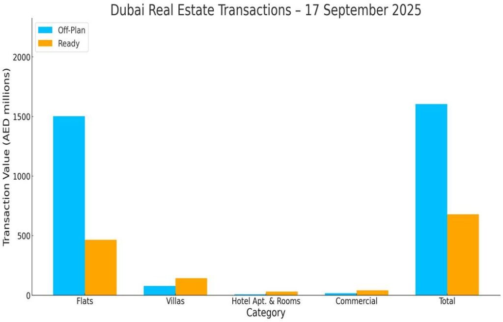 On the 17th of September 2025, the total transacted value reached AED 2,282,757,284. Off-plan dominated with AED 1,603,816,997 (70.3%), while Ready accounted for AED 678,940,286 (29.7%).