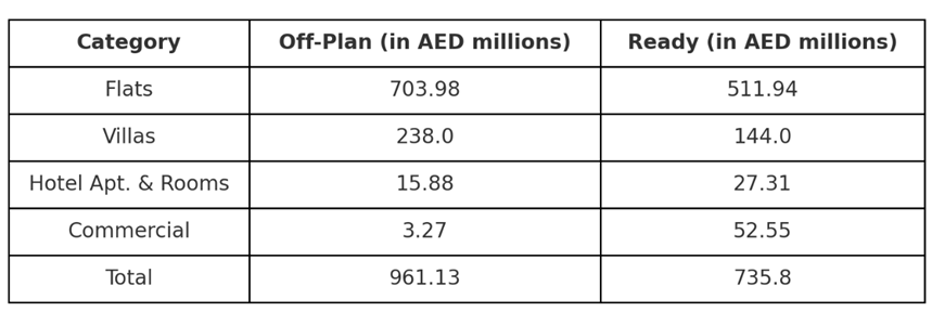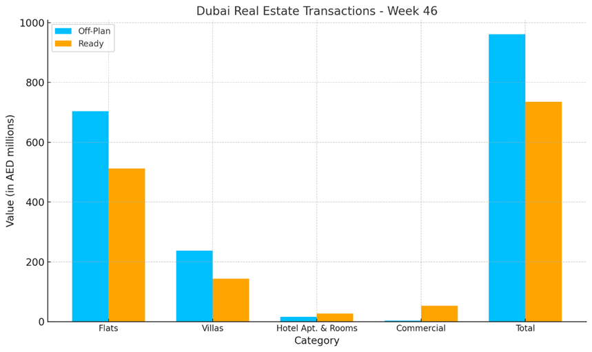 • Hotel Apartments & Rooms recorded AED 27.31 million in transactions, making up 3.7% of the ready property category. This reflects continued interest in hospitality-linked investments, particularly from investors seeking stable rental returns.