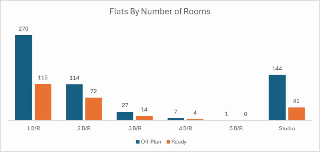 Off-plan activity was heavily concentrated in flats, which accounted for more than four-fifths of all off-plan value, with villas adding a meaningful but secondary layer of demand and commercial/ hospitality remaining niche.