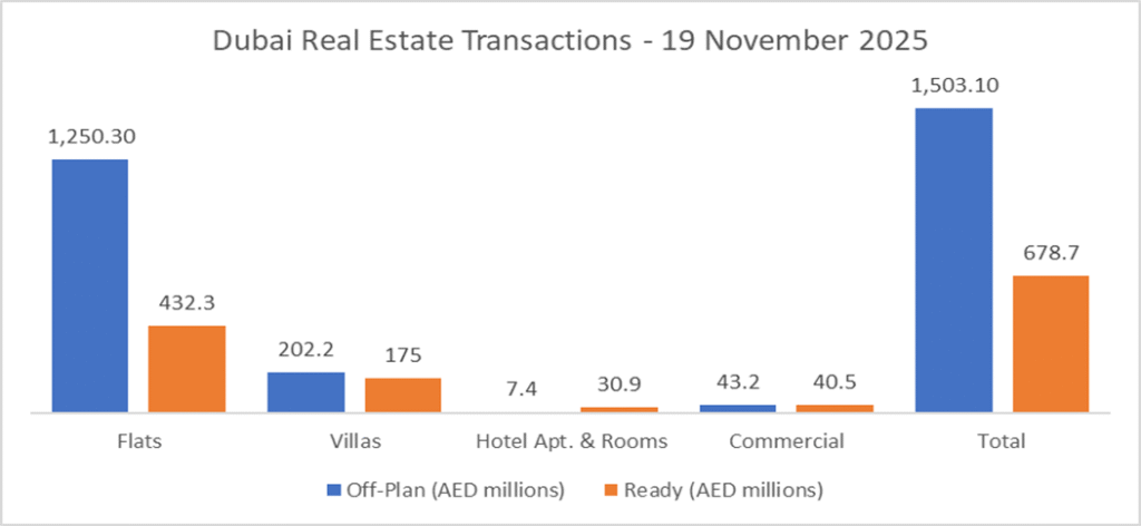 On 19-Nov-2025, the total transacted value reached AED 2,181,823,971. Off-plan dominated with AED 1,503,117,100 (68.9%), while Ready accounted for AED 678,706,872 (31.1%).