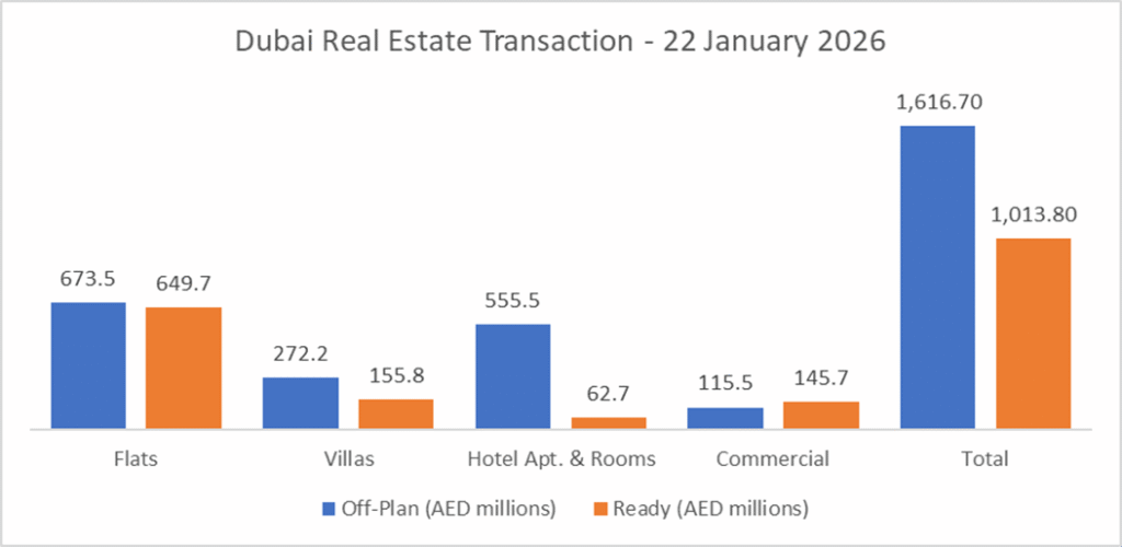 On the 22-Jan-2026, the total transacted value reached AED 2,630,510,325. Off plan dominated with AED 1,616,677,232 (61.5%), while Ready accounted for AED 1,013,833,093 (38.5%).