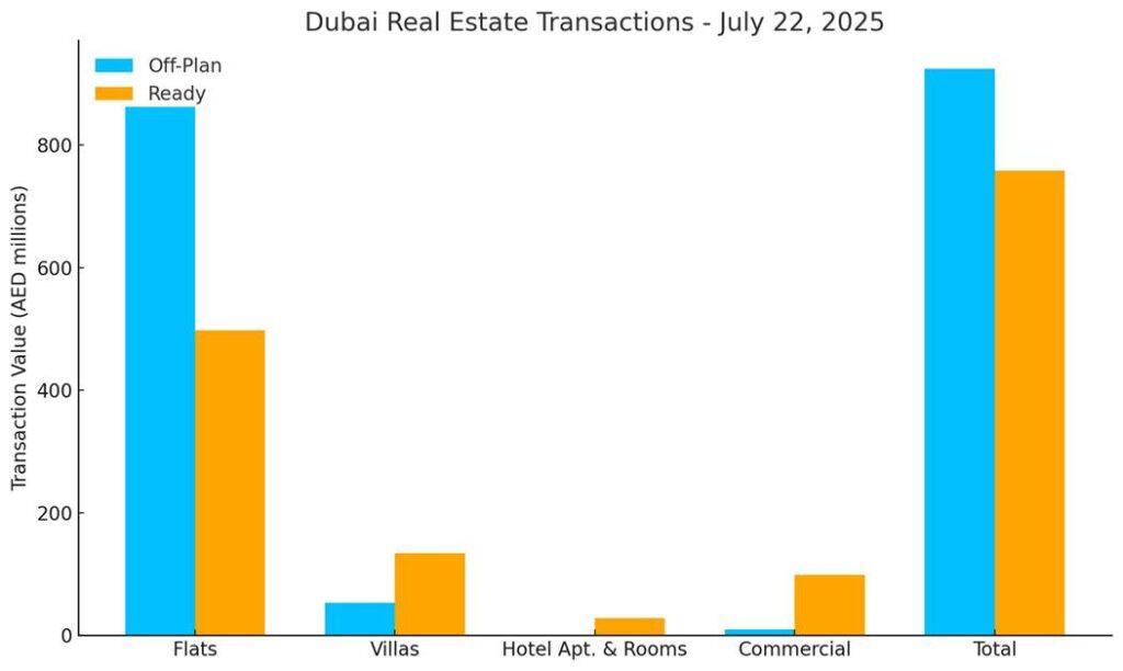 On 22 July 2025, Dubai’s real estate transactions totaled AED 1.683 billion. Off-plan sales contributed AED 924.8 million (54.9%) and ready properties AED 758.4 million (45.1%), reflecting a slight bias toward developer-led projects.