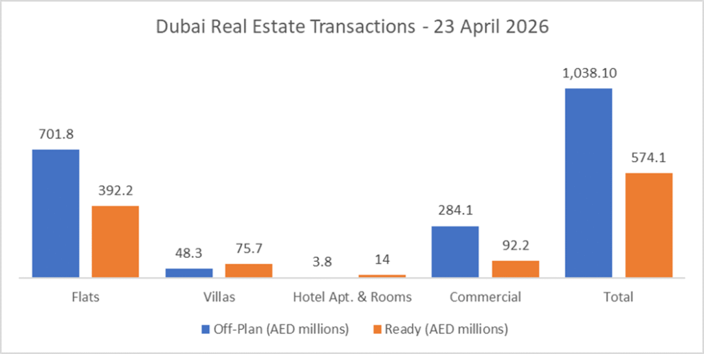 On the 23-Apr-2026, the total transacted value reached AED 1,612,205,549. Off-plan dominated with AED 1,038,098,309 (64.4%), while Ready accounted for AED 574,107,240 (35.6%).