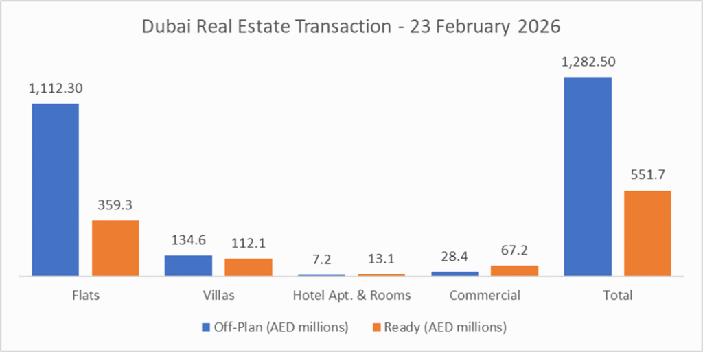 On the 23-Feb-2026, the total transacted value reached AED 1.83bn. Off-plan dominated with AED 1.28bn (69.9%), while Ready accounted for AED 551.7m (30.1%).