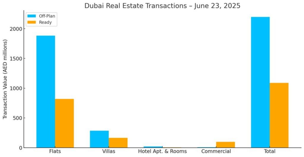 On 23 June 2025, Dubai’s total real estate transactions reached AED 3.286 billion. Off-plan sales dominated with AED 2.197 billion (66.9%), while ready properties contributed AED 1.090 billion (33.1%).
