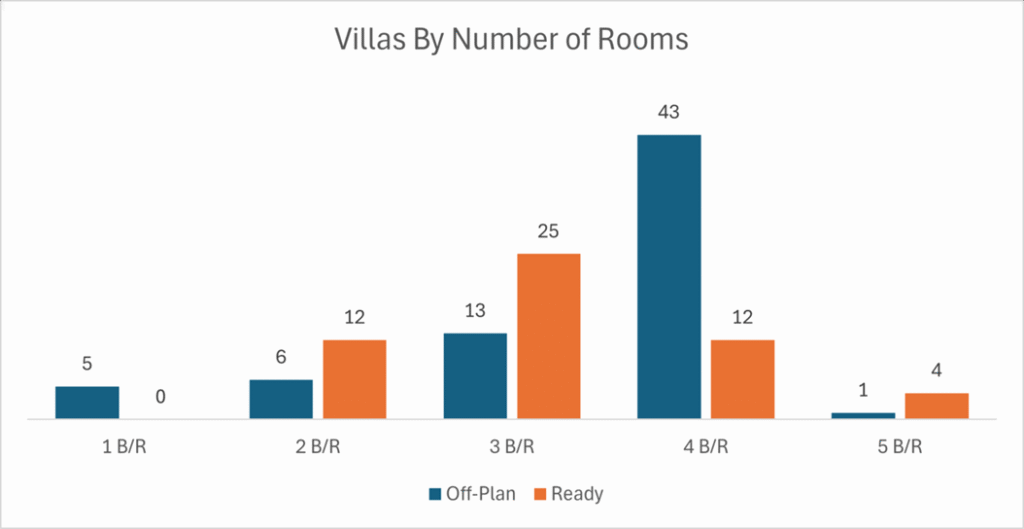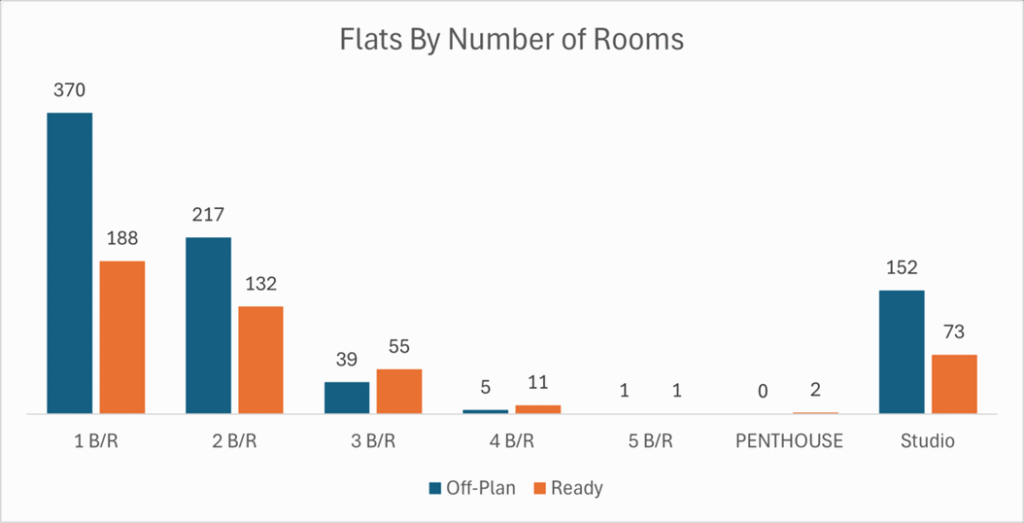 Flats remain the cornerstone of off-plan activity, reflecting strong pre-launch interest, while villas capture a modest one-eighth of the segment.