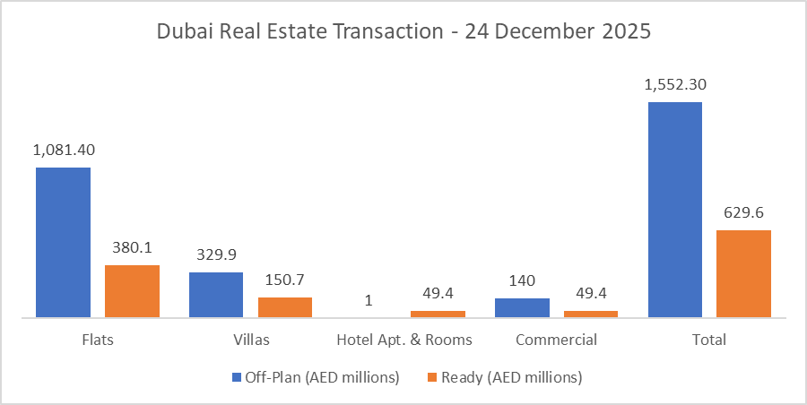 On the 24-Dec-2025, the total transacted value reached AED 2,181,858,624. Off plan dominated with AED 1,552,308,285 (71.1%), while Ready accounted for AED 629,550,339 (28.9%).
