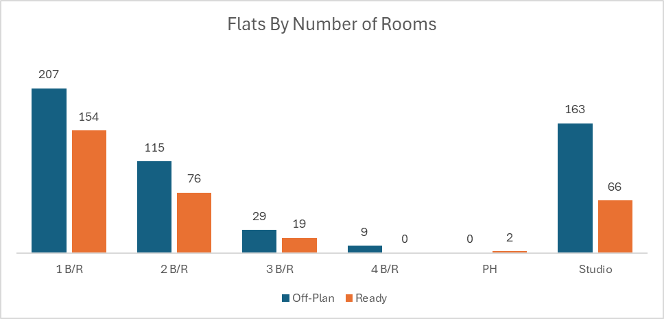 Off-plan activity was overwhelmingly apartment-led, with flats contributing roughly seven-tenths of off-plan value.